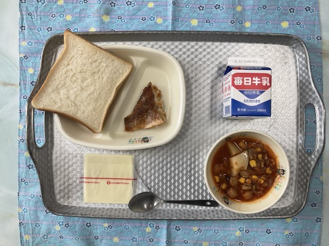 今日の献立・・・ミネストローネ、赤魚のバーベキューソース、スライスチーズ、食パン、牛乳です。