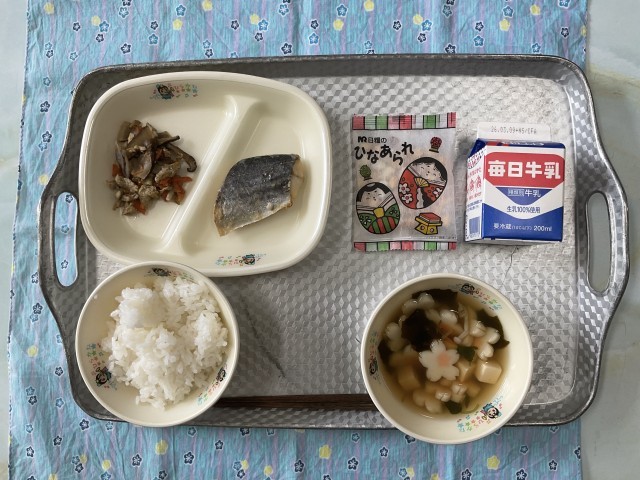 今日の献立・・・「ひな祭り献立」・・すまし汁、サワラの西京焼き、ちらし寿司の具、ひなあられ、すしご飯、牛乳です。