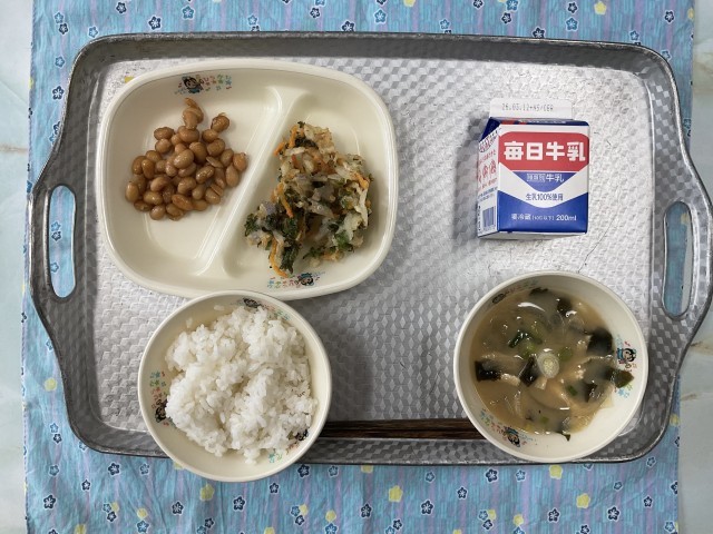 今日の献立・・・みそ汁、菜の花のかき揚げ、ブドウ豆、ご飯、牛乳です。