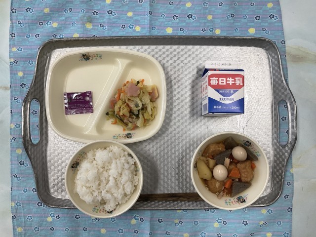 今日の献立・・・関東煮、煮浸し、ゆかりふりかけ、ご飯、牛乳です。