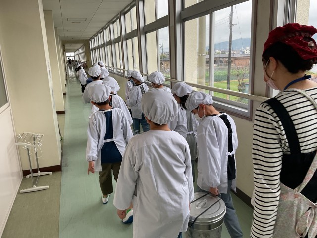 本日の給食は「味噌汁」「ぶたスタミナ丼」「ビーフンの炒め物」でした。とても美味しくいただきました!係の人も学級ごとにまとまってお仕事をしてくれています。