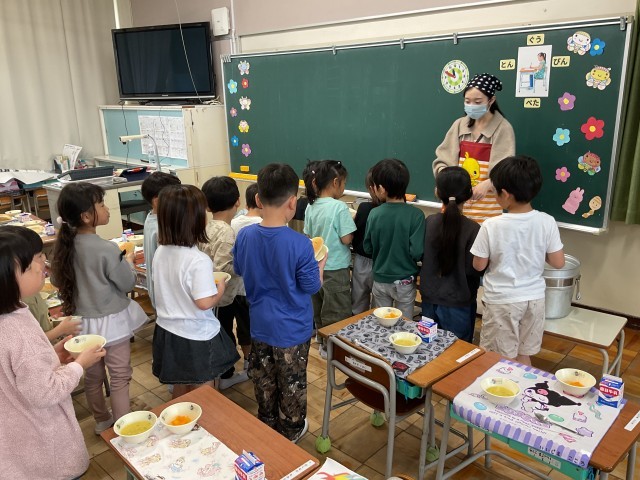 今日は1年生にとって初めての学校給食の日でした。おかずや牛乳をどこに置くのか1つ1つ確認したり、量を調整したりした後、いよいよお待ちかねの「いただきます!」。「美味しい」「もっと食べれるよ」など本当に嬉しそうな様子でした。
