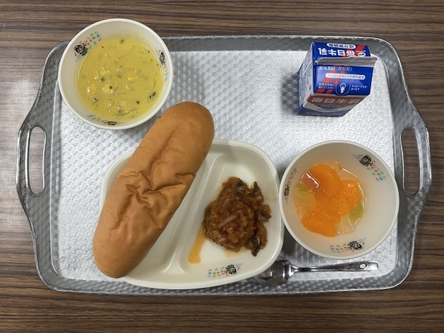 今日の給食は、コッペパン・とうもろこしスープ・チキンハンバーグ・フルーツポンチ・牛乳 でした!明日も美味しくいただきましょう!