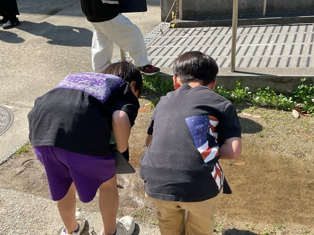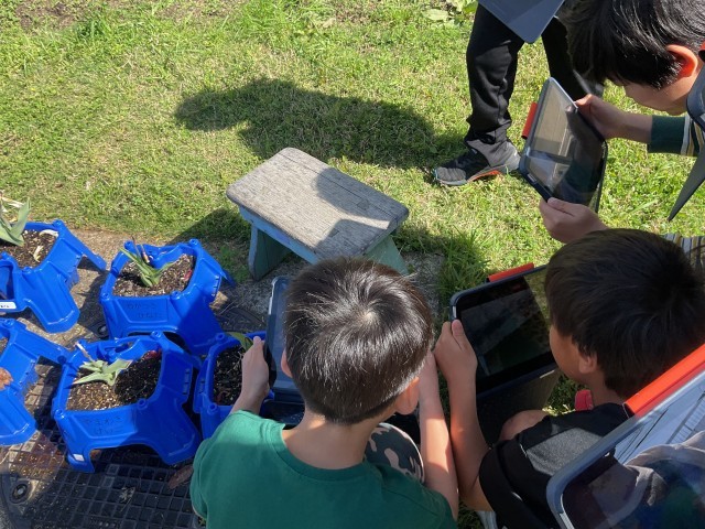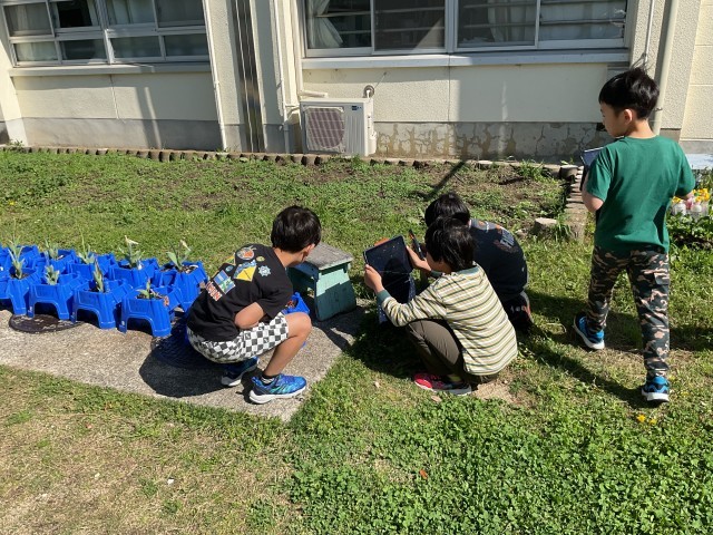 2年生は校内で「はるさがし」をしました。教室内でも積極的に手が挙がり、前向きに授業に参加する様子は変わりません。教室を出て、色々な「はる」を探しますが、大人が気がつかない気付きがたくさんあります。小さな てんとう虫を見つけると、先生のところに来て「てんとう虫を見つけたよ!」と笑顔でタブレットの写真や動画を持って報告に来てくれます。また、見つけた子どもたちの「てんとう虫だ!」という一言で、周りのお友達も一斉に集まってきます。子どもたちの大人とは違う発信力のすごさに感心します。虫だけでなく、たくさんの草や木や様々な「はる」を見つけ、そして感じ、タブレットで記録しました。記録した資料を使って、次回以降それぞれが「さがしたはる」をまとめていきます。どんな「はる」を見つけてくれたのか楽しみです!