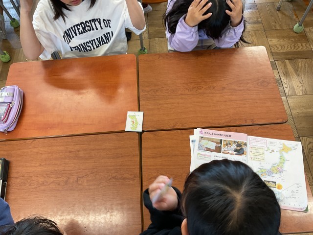 社会では、大阪府周辺の都道府県の名前や位置を確認するために、都道府県の場所を示したカードを見て、班の中で競い合うカルタゲームをしました。言われた都道府県をすぐにカードをとれた班、うっすら分かってはいるけれど自信がなくてカードをとれなかった班・・・様々ですが、全ての班が楽しく参加でき、都道府県に慣れていくきっかけになりました。