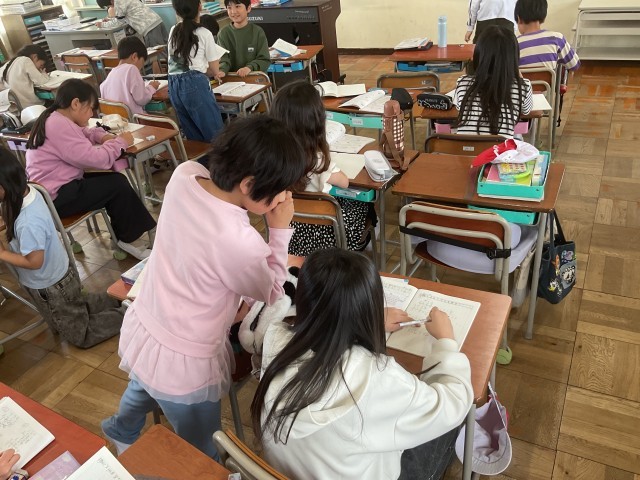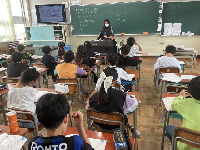 4年生は算数と体育に取り組んでいました。算数では億というかなり大きな単位を10倍、1/10倍する計算や3桁×3桁を筆算で計算する方法に取り組みました。どちらも普段あまり身近ではない大きな数字ではありましたが、先生の説明をよく聞き、丁寧に取り組んでいます。また先生から教わるだけでなく、お友達との交流の時間も子どもたちにとっては貴重な学びの時間です。教わるだけでなく、「教えあう」ことで受け身の学びから脱却するだけでなく、違いを学びにつなげる思考力も身につき、知識を活かす学びの定着につながっていきます。