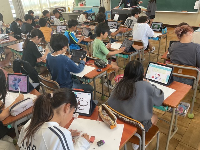 また、図工の時間には一転してリラックスした表情に。 大好きなキャラクターを楽しそうに描く子どもたちの姿が見られ、教室はクリエイティブな熱気と笑顔でいっぱいになりました。