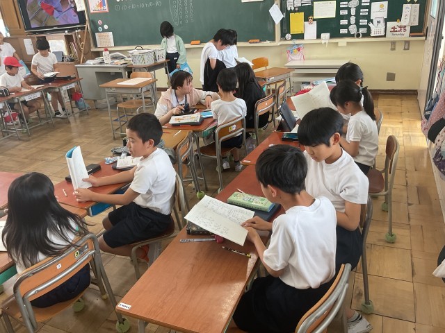 また、算数では「学んだことをつかおう」というテーマで、「10×4」の計算を工夫して考える学習をしていました。ある児童に「校長先生にも説明してくれる?」と声をかけると、少し照れながらも、ノートに書いた数式や図を指差しながら、一生懸命に自分の考えを伝えてくれました。 驚いたのは「多角的な視点」です。 単に「10のまとまり」として捉えるだけでなく、「別の数字の組み合わせ」に分けて考えるなど、様々な気付きを併せて、伝えてくれました。