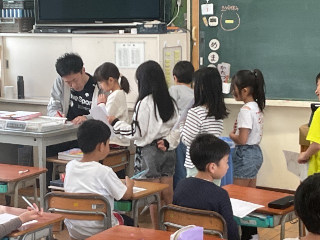 国語の授業では、それぞれが学習プリントに取り組んでいました。 解き終えた子から先生のもとへ提出に行きますが、そこでは単なる「○付け」以上の時間が流れています。先生は一人ひとりにその場で声をかけ、「ここがしっかり書けているね」「ここはもう少し頑張ってみようか」と、個別に振り返りをしていきます。先生からかけられるその温かな一言一言が、子どもたちにとって、次の一歩を踏み出す大きな支えと自信になっているのを感じました。