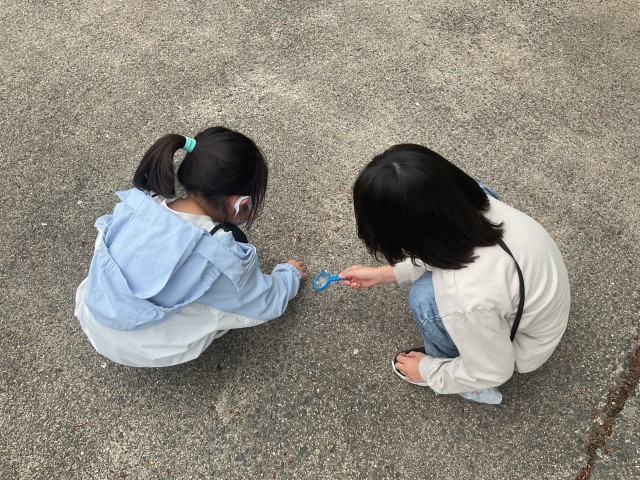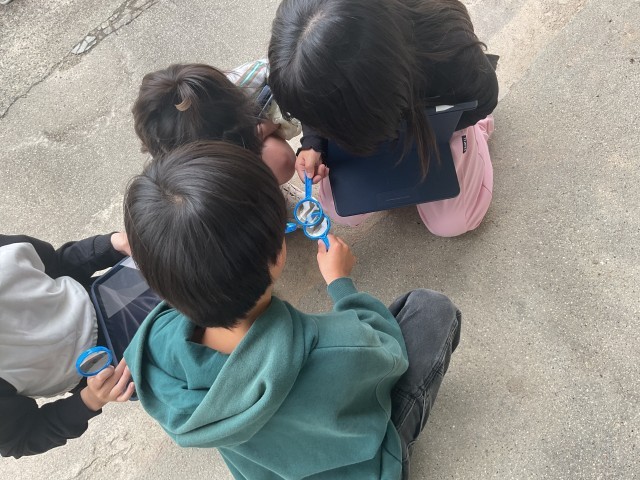 普段は何気なく見ている景色も、虫眼鏡というフィルターを通すと、驚くほど表情を変えます。どこにでもいるはずのダンゴムシであっても、普段とは違った見え方がする世界に、子どもたちは、その足の動きや体の質感に興味津々。「校長先生、見て!」と、あちこちから嬉しそうな報告が届きます。