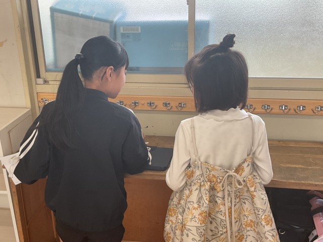 今日はその集大成となる録画の日。タブレットを手に、子どもたちは一斉に教室を飛び出します。同じ室内だと互いの声が入ってしまうため、「どこなら一番いい声で録れるかな?」と、自分たちで最適な場所を探しに出かけたました。空き教室、静かな渡り廊下、階段の踊り場……。校内のあちこちが、子どもたちの真剣な「学びの場」に変わっていきます。まさに「学びの場所は教室だけではない」ことを実感させてくれる光景でした。
