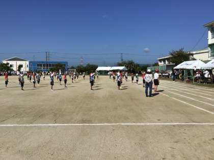 今年の運動会も、まず開会式から始まりました。今年は感染症対策のため、運動場には1年生のみ、2年生から6年生は教室で中継を見る、という形で行いました。開会の言葉、校歌演奏に続いて、校長の言葉と児童の言葉がありました。その後、引き続いて準備体操を行いました。