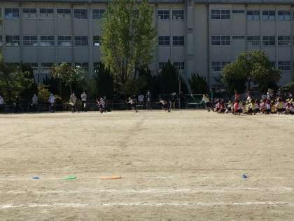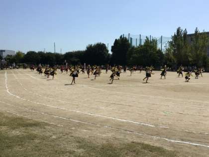 3年生です。「ラン!サン!チャレンジャー」では、赤・黄のハチマキをたなびかせながら颯爽と走っていました。「パワフルエイサー!!」は、みんなのポーズもしっかり決まってかっこよかったです。