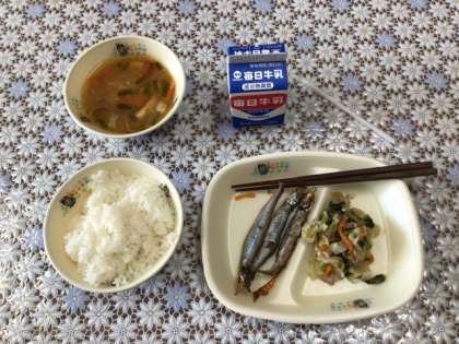 今日の給食は、ご飯、牛乳、豚汁、ししゃも、小松菜の炒め物でした。