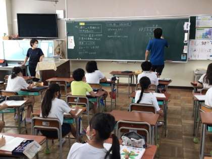 4年生の算数科です。今日のめあては「積や商の見積もりの仕方を考えよう」です。かけ算やわり算を使って見積もりを計算していきます。