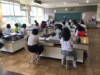 今日は家庭科室での授業です。5年生の家庭科で、めあては「アイロンをかけよう」です。みんな上手にできるでしょうか。