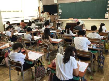 3年生では、国語科の「パラリンピックが目指すもの」のテストに取り組んでいました。みんな静かに集中していました。