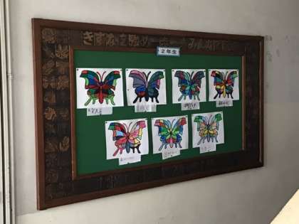 教室棟2階の掲示板に2年生の作品が飾ってありました。それぞれの個性があふれる、美しい作品が並んでいました。