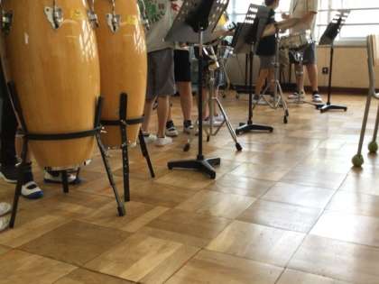 5年生の音楽科です。今日のめあては「班でつくったリズムアンサンブルを練習しよう」です。班ごとに協力しあって、打楽器を使ってリズムアンサンブルの練習をしていました。