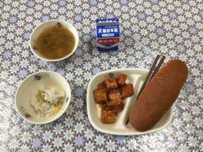 今日の給食は、コッペパン、牛乳、野菜スープ、厚揚げのチリソース、栗おこわでした。