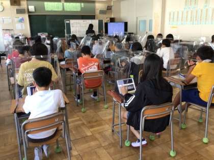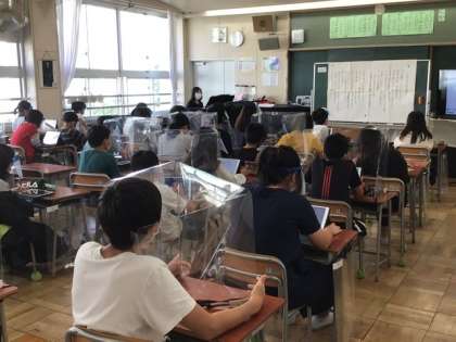 6年生の音楽科です。今日は「ヒロシマの有る国で」の歌を学習していました。リコーダーの学習ではフェイスガードやついたても使用しての学習です。