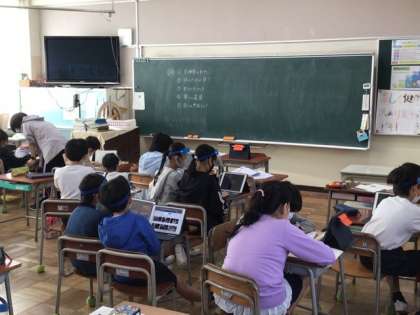 4年生の社会科の授業です。「天神祭」について調べていました。タブレットを活用して、みんなで協力し合って、学習していました。