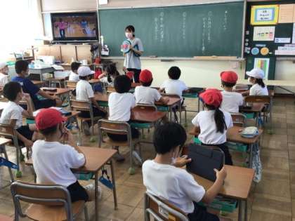 2年生の体育科の授業です。今日はドッチビーに取り組みます。まず、教室で動画を使って学習した後、体育館で練習をしていました。