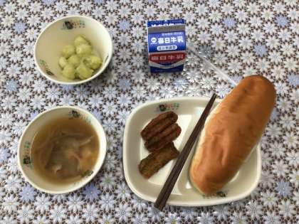 今日の献立は、コッペパン、牛乳、中華スープ、竹輪の磯辺揚げとくるみ餅でした。