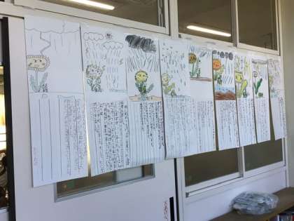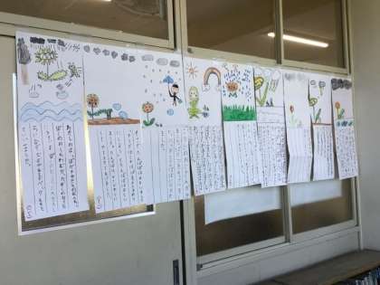 参観で来られた方はご覧になったこととは思いますが、今、2年生の教室の前の窓には、このようなかわいい作品が貼ってあります。子どもたちの持つ個性が発揮されています。