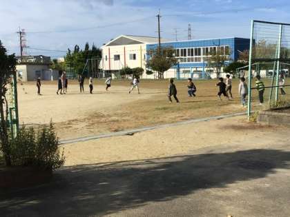 朝から元気いっぱいです。子どもたちと先生で一緒にフリスビーを楽しんでいました。