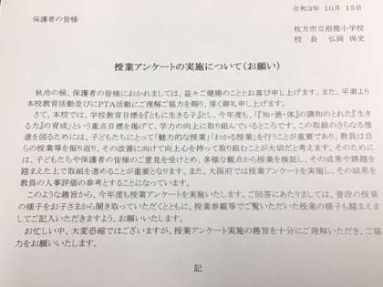 くれぐれも、別々のアンケートを一つの封筒に同封されることがございませんように、ご協力をお願いいたします。お忙しい中、誠に申し訳ございませんが、これからのよりよい学校運営ならびに子どもたちのために役立ててまいりますので、よろしくお願いいたします。
