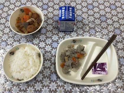 さて、今日の学校の給食は、ご飯、牛乳、豚肉と大根の煮物、れんこんの甘酢和え、ゆかりふりかけです。