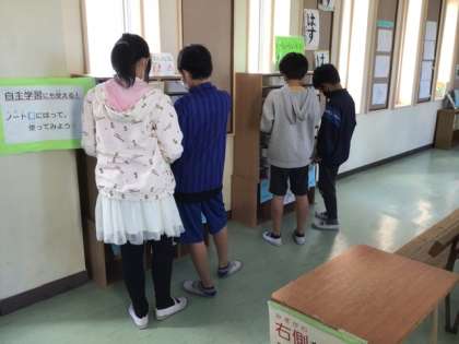 今日の6年生の算数科です。授業で使うということで、子どもたちが自主学習コーナーのプリントを取りに来ていました。