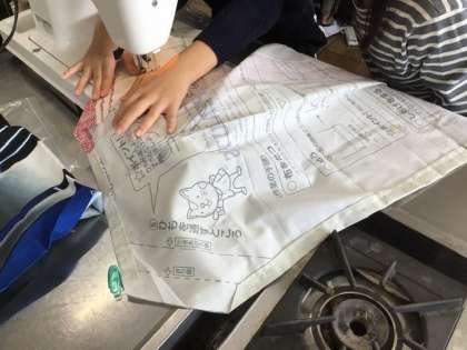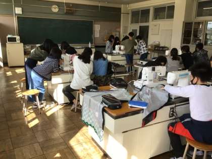 5年生の家庭科の授業、家庭科室です。今日はミシンを使ってエプロンを作っていました。みんな頑張っています。