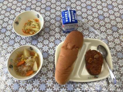 今日はコッペパン、牛乳、スープ煮、豆腐ハンバーグ、キャベツのソテーでした。