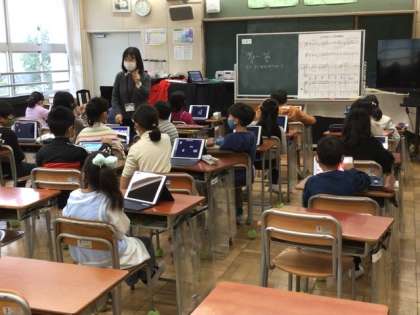 みんなで手拍子を打って、リズムをとりながら、タブレットに録音していました。その後もタブレットを活用しながら、歌「とどけよう このゆめを」の学習を行っていました。