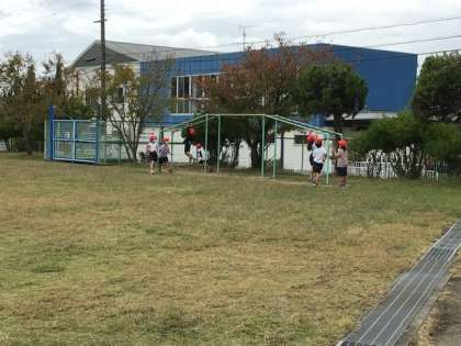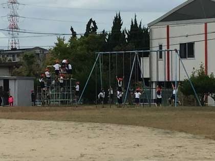 1年生の運動場での体育科の授業です。子どもたちは、うんてい、のぼり棒、ジャングルジム、そして鉄棒と、元気よく頑張っていました。