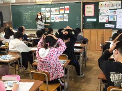 5年生の外国語の授業です。今日のめあては「国でできることを伝える言い方を知ろう」です。子どもたちは、みんな元気よく授業に参加していました。