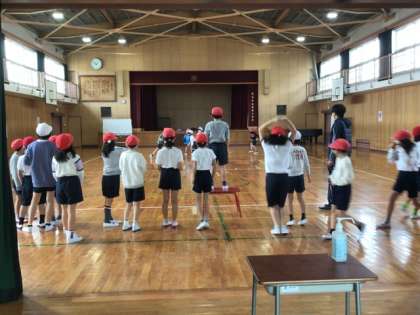 3年生の体育科、体育館での授業です。今日は、ポートボールです。まずは、基本的なボールわたしの練習からです。