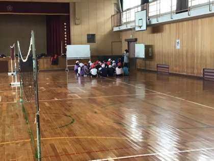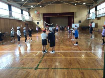4年生の体育科の授業です。今日は体育館です。みんあで力を合わせて、バレーボールに取り組みます。