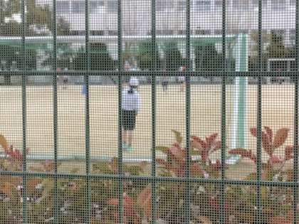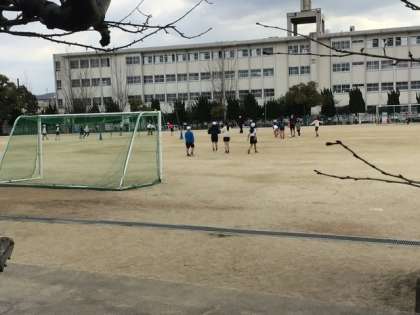運動場での5年生の体育科の授業です。子どもたちは、サッカーに取り組んでいました。