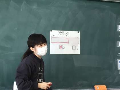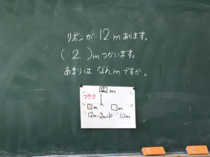 なかよし学級の授業、2年生の算数科です。今日の学習は「たし算とひき算」です。めあては「テープ図に表し式と答えを考えよう」です。
