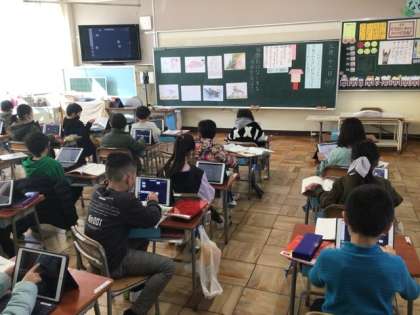 1年生の国語科です。今日の学習のめあては「おはなしをならびかえよう」です。子どもたちはタブレットを活用して頑張っていました。