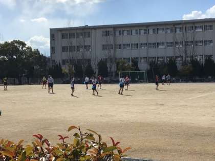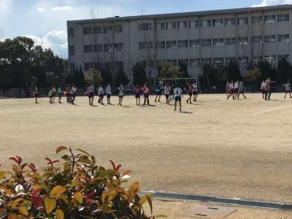 6年生の体育科の授業、運動場です。天気はいいのですが、冷たい風が強く吹いています。それでも、子どもたちは元気に取り組みを進めています。