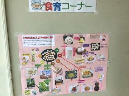 現在の食育コーナーは、このような感じです。今は「畑の肉」、大豆についての情報です。
