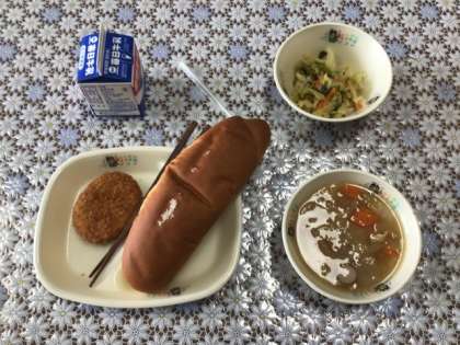 今日の給食です。献立は、コッペパン、牛乳、冬野菜のスープ、コロッケ、チンゲン菜のソテーです。