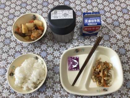 2月17日(木) 今日の給食の献立は、ご飯、牛乳、関東煮、クーブイリチ、ゆかりふりかけです。