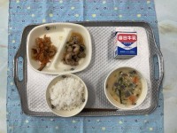 今日の献立は、つきみ汁、とうがんと豚肉の炒めに、月見だんご、かやくごはん、牛乳です。中秋の名月にちなんだ献立です。