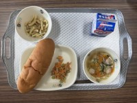 今日の献立:とうふチゲ、しゅうまい、もやしのナムル、ご飯、牛乳です。