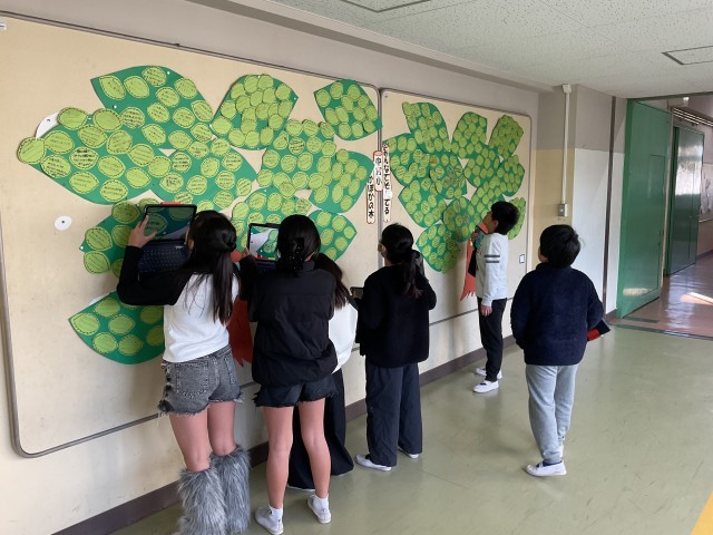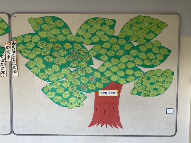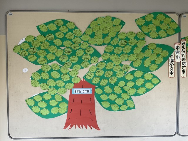 全校児童が、ぽかぽか(いいところ探し)カードを書いて大きな木が完成しました。
